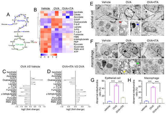 Itaconate regulates energy metabolism and mitochondrial morphology in allergic airway inflammation. (A) Schematic overview of metabolites involved in glycolysis and TCA cycle. (B) Heatmap showing relative levels of glycolysis and TCA cycle intermediate metabolites in vehicle, OVA and OVA+ITA group (three mice per group). (C) Fold change of glycolysis and TCA cycle metabolites in OVA group as compared with vehicle group. (D) Fold change of glycolysis and TCA cycle metabolites in OVA+ITA group as compared with OVA group. (E) Representative lung section showing mitochondrial morphological changes in epithelial cells. Scale bar: 1 μm. (F) Representative lung section showing mitochondrial morphology changes in lung macrophages. Scale bar: 2 μm. (G,H) The rates of abnormal mitochondria in epithelial cell and macrophage from vehicle, OVA and OVA+ITA group. Red arrowhead indicates cavity formation, blue arrowhead indicates black dense compact, yellow arrowhead indicates crista loss and rupture and green arrowhead indicates swelling. Data expressed as means ± SEM (n = 3). * p < 0.05, ** p < 0.01, *** p < 0.001.