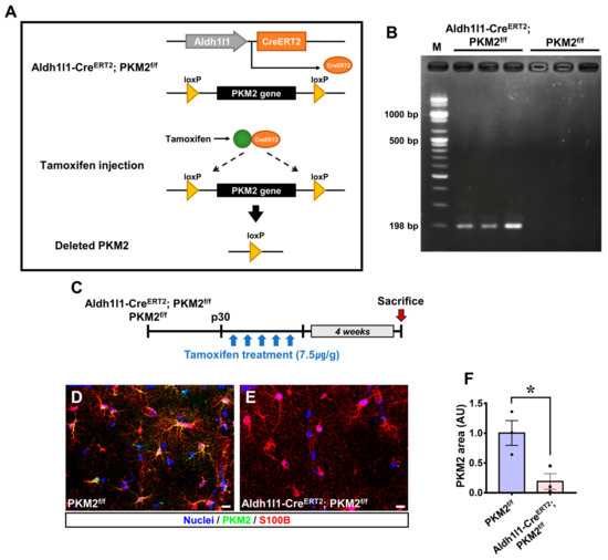 (A) Tamoxifen-induced PKM2 gene deletion was confirmed by PCR genotyping and immunofluorescence in the cornus ammonis 1 (CA1) region. Schematic structure in which the PKM2 gene is deleted from Aldh1l1-CreERT2; PKM2f/f after administration of tamoxifen. (B) PCR genotyping of representative showed mice with a 198 bp PCR product specifically for the Aldh1l1-CreERT2; PKM2f/f gene (Aldh1l1-CreERT2; PKM2f/f, PKM2 (-/-); PKM2f/f, PKM2 wild type). (C) Schematic representation showing that Aldh1l1-CreERT2; PKM2f/f group and PKM2f/f group were sacrificed 4 weeks after administration of tamoxifen (7.5 μg/g, i.p.) for 5 days once daily after p30. (D,E) Representative image showing expression of PKM2 (green) and S100B (astrocyte marker, red) in the CA1 regions of the hippocampus. Scale bar = 50 μm. (F) Graph showing the PKM2 area (AU) intensity in the CA1 region. The PKM2 area was decreased in the Aldh1l1-CreERT2; PKM2f/f group (●PKM2 f/f, n = 3; ■Aldh1l1-CreERT2; PKM2f/f, n = 3). * Significantly different from the PKM2f/f group, Aldh1l1-CreERT2; PKM2f/f group, p < 0.05. (Bonferroni post hoc test after Kruskal–Wallis test: p = 0.050, df = 1, chi square = 3.857). Data are shown as mean ± SEM.