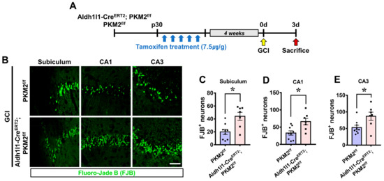 Neuronal death caused by global cerebral ischemia (GCI) was confirmed and measured through Fluoro-Jade B (FJB) staining. The experimental timeline shows that GCI was induced 4 weeks after tamoxifen administration, and the mice were sacrificed at 3 days following GCI (Figure 2A). Degenerating neurons found in the subiculum, CA1, and CA3 regions were compared between the GCI-Aldh1l1-CreERT2; PKM2f/f group and the GCI-PKM2f/f group (Figure 2B). The GCI-Aldh1l1-CreERT2; PKM2f/f group displayed an increase in FJB+ neurons of about 54% in the subiculum (GCI-Aldh1l1-CreERT2; PKM2f/f, 43.9 ± 6.2; GCI-PKM2f/f, 19.9 ± 3.9), 50% in the CA1 (GCI-Aldh1l1-CreERT2; PKM2f/f, 66.0 ± 9.3; GCI-PKM2f/f, 32.9 ± 6.2) and 39% in the CA3 (GCI-Aldh1l1-CreERT2; PKM2f/f, 86.7 ± 12.4; GCI-PKM2f/f, 52.9 ± 6.8) regions compared with the GCI-PKM2f/f group (Figure 2C–E).