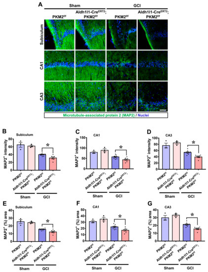 (A) Microtubules visualized through staining of microtubule-associated protein 2 (MAP2, green) in the subiculum, CA1, and CA3 regions 3 days after GCI. Scale bar = 100 μm. (B–G) Graph showing the MAP2+ intensity and percent area in the subiculum, CA1, and CA3. The GCI groups shows that there is lower MAP2+ staining intensity and (%) area in the Aldh1l1-CreERT2; PKM2f/f group compared with the PKM2f/f group (●Sham-PKM2f/f group, n = 3; ■Sham-Aldh1l1-CreERT2; PKM2f/f, n = 3; ▲GCI-PKM2f/f group, n = 9, ▼GCI-Aldh1l1-CreERT2; PKM2f/f, n = 7). * Significantly different from the PKM2f/f group, Aldh1l1-CreERT2; PKM2f/f group, p < 0.05. Data are shown as mean ± SEM (Bonferroni post hoc test after Kruskal–Wallis test, subiculum: chi square = 17.112, df = 3, p = 0.001; CA1: chi square = 16.236, df = 3, p = 0.001; CA3: chi square = 18.160, df = 3, p < 0.001).