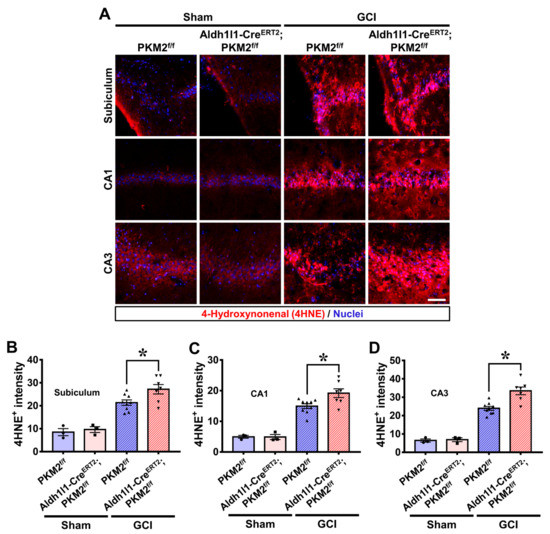 To confirm whether GCI-induced reactive oxygen species (ROS) cause damage, we used 4-hydroxynonenal (4-HNE) staining to detect lipid peroxidation. The mice were sacrificed at 3 days after GCI. Histological evaluation of lipid peroxidation with 4-HNE was measured in the hippocampal regions. The sham group indicated no difference in the 4-HNE signal. However, the GCI groups showed a drastic increase in 4-HNE fluorescence signal. In particular, the GCI-Aldh1l1-CreERT2; PKM2f/f group showed a significantly increased 4-HNE intensity compared with the GCI-PKM2f/f group (Figure 4A). Lipid peroxidation was higher in the GCI-Aldh1l1-CreERT2; PKM2f/f group compared with the GCI-PKM2f/f group by about 21% in the subiculum (GCI-PKM2f/f, 21.3 ± 1.1; GCI-Aldh1l1-CreERT2; PKM2f/f, 27.1 ± 2.0), 22% in the CA1 (GCI-PKM2f/f, 14.9 ± 0.7; GCI-Aldh1l1-CreERT2; PKM2f/f, 19.1 ± 1.4), and 28% in the CA3 (GCI-PKM2f/f, 23.9 ± 1.0; GCI-Aldh1l1-CreERT2; PKM2f/f, 33.4 ± 2.0) regions (Figure 4B–D).