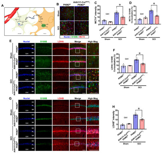 The astrocyte–neuron lactate shuttle (ANLS) hypothesis indicates that glucose absorbed by astrocytes is converted to pyruvate through the glycolysis process, and lactate converted through lactate dehydrogenase A (LDHA) is then transferred to neurons through monocarboxylate transporter 4 (MCT4). Lactate transferred to neurons through MCT2 is transformed back to pyruvate and used as an energy source to produce ATP via mitochondria (Figure 5A). We showed CA1 as representative images and data since it is the most vulnerable hippocampal regions in the brain after ischemia [36,37]. MCT4 is one of the transporters that releases lactate from astrocytes in the gaps between astrocytes and neuronal space. To examine the expression of MCT4, we conducted double staining of MCT4 (red) and S100B (astrocyte marker, green). No differences in MCT4 fluorescence signals were observed in the sham groups. Much higher MCT4 fluorescence signal was observed in the GCI groups compared with the sham groups. However, the GCI-Aldh1l1-CreERT2; PKM2f/f group had significantly reduced MCT4 expression compared with the GCI-PKM2f/f group (Figure 5B). MCT4 and S100B co-localization was lower in the GCI-Aldh1l1-CreERT2; PKM2f/f group compared with the GCI-PKM2f/f group, by about 37% and 39% in the CA1 region (GCI-PKM2f/f, 15.8 ± 1.0 and 15.2 ± 2.3; GCI-Aldh1l1-CreERT2; PKM2f/f, 9.9 ± 0.9 and 9.2 ± 1.9) (Figure 5C,D). MCT2 is a type of transporter that takes up extracellular lactate. To evaluate the expression of MCT2 in neurons, we identified live neurons and MCT2 staining in the hippocampal region (Figure S1A). MCT2 expression did not differ between the sham groups but was comparatively lower in the GCI groups. Moreover, in the GCI groups, MCT2 expression was significantly reduced by 23% in GCI-Aldh1l1-CreERT2; PKM2f/f compared with GCI-PKM2f/f (GCI-PKM2f/f, 11.8 ± 1.6; GCI-Aldh1l1-CreERT2; PKM2f/f, 9.1 ± 1.3) (Figure S1B). LDHA is an enzyme that converts pyruvate to lactate in astrocyte. To investigate GCI-induced LDHA overexpression in astrocytes, we performed LDHA (red) and S100B (astrocyte marker, green) double staining at 3 days after GCI. We found that co-localized LDHA expression was specifically localized in astrocytes. There were no differences in LDHA and S100B co-localized fluorescence signals in each sham group. The GCI groups had significantly increased LDHA and S100B co-localized fluorescence signals in the hippocampal CA1 region. However, a striking decrease in co-localization signal was observed in the GCI-Aldh1l1-CreERT2; PKM2f/f group compared with the GCI-PKM2f/f group (Figure 5E). In the GCI-Aldh1l1-CreERT2; PKM2f/f group, LDHA and S100B co-localized fluorescence signal was significantly reduced by about 30% in the CA1 region (GCI-PKM2f/f, 17.3 ± 0.8; GCI-Aldh1l1-CreERT2; PKM2f/f, 12.0 ± 0.7) (Figure 5F). LDHB is an enzyme that is required for conversion of lactate into pyruvate in neurons. We assumed that expression of LDHB after GCI would rise to increase pyruvate and energy source production in responding to neuronal damage. However, in case of astrocyte PKM2 gene deletion, the expression of LDHB is also reduced because the amount of lactate received through the ANLS decreases. To confirm whether LDHB expression is regulated by the PKM2 gene, we used LDHB (red) and NeuN (neuron marker, green) staining after GCI. No difference in LDHB expression is observed in the sham groups. However, in the GCI groups, there was an increase in LDHB fluorescence signal in the hippocampal CA1 region. GCI-Aldh1l1-CreERT2; PKM2f/f groups showed significantly reduced LDHB intensity in neurons compared with the GCI-PKM2f/f groups (Figure 5G). LDHB was reduced in the GCI-Aldh1l1-CreERT2; PKM2f/f groups compared with the GCI-PKM2f/f groups by about 33% in the CA1 region (GCI-PKM2f/f, 15.2 ± 0.7; GCI-Aldh1l1-CreERT2; PKM2f/f, 10.2 ± 0.5) (Figure 5H).