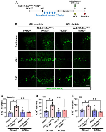 (A) Schematic representation showing injection of lactate immediately after GCI, and mice are sacrificed 3 days later. (B) Degenerated neurons in the subiculum, CA1, and CA3 regions. The GCI-lactate Aldh1l1-CreERT2; PKM2f/f group showed a reduction in degenerated neurons (FJB, green) 3 days after ischemia compared with the GCI-vehicle Aldh1l1-CreERT2; PKM2f/f group. Scale bar = 100 μm. (C–E) Graph indicates quantification of GCI-vehicle group compared with the GCI-lactate group (●GCI-vehicle PKM2f/f group, n = 7; ■GCI-vehicle Aldh1l1-CreERT2; PKM2f/f group, n = 5; ▲GCI-lactate PKM2f/f group, n = 7; ▼GCI-lactate Aldh1l1-CreERT2; PKM2f/f group, n = 6). *Significantly different from the GCI-vehicle PKM2f/f group, GCI-vehicle Aldh1l1-CreERT2; PKM2f/f group and the GCI-vehicle Aldh1l1-CreERT2; PKM2f/f group, GCI-lactate Aldh1l1-CreERT2; PKM2f/f group, * p < 0.05, ** p < 0.05. Data are shown as mean ± SEM (Bonferroni post hoc test after Kruskal–Wallis test, subiculum: chi square = 9.693, df = 3, p = 0.021; CA1: chi square = 8.572, df = 3, p = 0.036; CA3: chi square = 8.074, df = 3, p = 0.045).