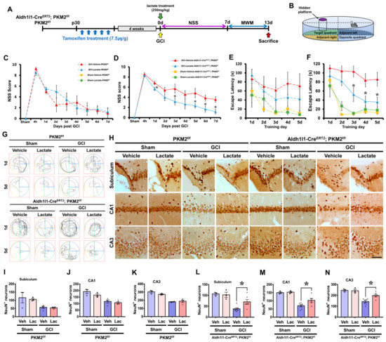 Finally, to show whether lactate administration had beneficial effects on neurological behavioral after GCI, we conducted tests for both the Morris water maze (MWM) and the neurological severity score (NSS). The NSS test is a scale for evaluating neurological deficit that is commonly used for brain injuries after stroke and hypoglycemia. The MWM test is one of the most common spatial learning and memory tests for animals [32,62,63,64]. In the present study, we found that the NSS increased and cognitive function decreased in PKM2 gene-deleted mice. However, lactate administration to PKM2 gene deletion mice significantly recovered the neurological severity and cognitive dysfunction even after GCI. In addition, to confirm whether live neurons were increased by lactate supplementation on day 13, we performed NeuN staining via immunohistochemistry in hippocampal subiculum, CA1, and CA3 regions after GCI. As a result, we found no differences between living neurons in the sham-PKM2f/f group, GCI-PKM2f/f group, and sham-Aldh1l1-CreERT2; PKM2f/f group. However, live neurons were significantly increased in the GCI-lactate-Aldh1l1-CreERT2; PKM2f/f group compared with the GCI-vehicle-Aldh1l1-CreERT2; PKM2f/f group. This shows that the administration of lactate to the GCI-induced PKM2 gene-deleted mice supplements the reduced energy source in neurons, thereby mitigating neuronal death. Therefore, we confirmed that lactate supply via the ANLS in astrocytes, even in cases of PKM2 gene deletion, plays a beneficial role in preventing neuronal damage, oxidative stress, microtubule disruption, and neurological and cognitive dysfunction through maintaining the energy supply in neurons. We also demonstrated that lactate administration is a potential beneficial tool for preventing neuronal damage and cognitive impairment after GCI.