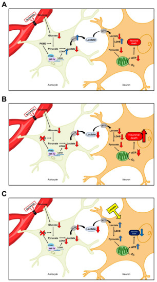- Yamagata, K. Lactate Supply from Astrocytes to Neurons and its Role in Ischemic Stroke-induced Neurodegeneration. Neuroscience 2022, 481, 219–231. [Google Scholar] [CrossRef] [PubMed]