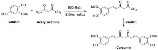 Curcumin synthesis by condensation of acetylacetone and vanillin.