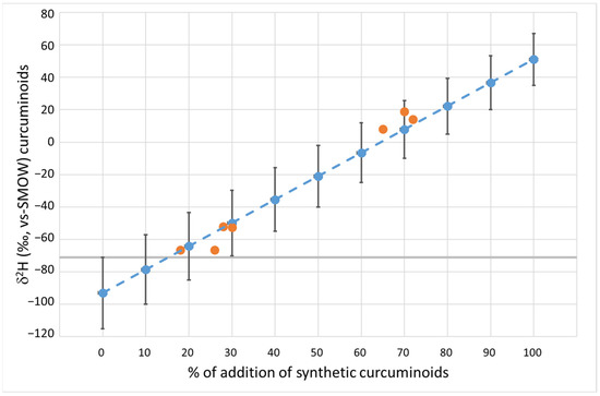 Variations in the δ2H values of natural curcuminoids with the addition of synthetic curcuminoids. The grey line defines the 95% threshold limit for authentic natural curcuminoids. Blue dots: mean value. Bars: 95% confidence limit. Orange dots: measured values of prepared mixtures.