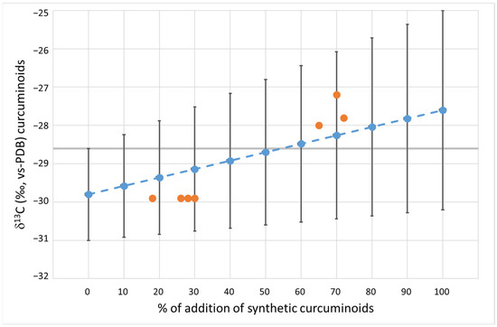 Variations in the δ13C values of natural curcuminoids with the addition of synthetic curcuminoids. The grey line defines the 95% threshold limit for authentic natural curcuminoids. Blue dots: mean value. Bars: 95% confidence limit. Orange dots: measured values of prepared mixtures.