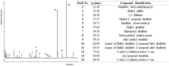 | 11 | Isomer of Diallyl disulfide (1-propenyl allyl disulfide) | 5.11 ± 0.10 | 4.22 ± 0.13 * | 2.22 ± 0.03 * | 2.39 ± 0.05 * | 3.22 ± 0.05 * | 0.94 ± 0.02 * |
