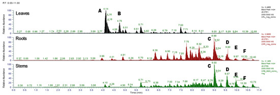 HRESI-MS/MS chromatograms of leaves, roots and stems of C. formosum ssp. pruniflorum.