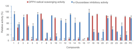 The biological activity of the isolated compounds were evaluated by measuring the DPPH radical scavenging and α-glucosidase inhibitory activity. As described above, compounds isolated from C. formosum ssp. pruniflorum in this study are aromatic compounds and can be subdivided according to the compound skeleton as follows: xanthones (1–18), a benzophenone (19), a simple phenolic (20) and flavonoids (21–25). These isolated compounds showed good antioxidant and α-glucosidase inhibitory activity but differential efficacy depending on the structures (Figure 3).