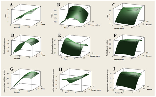 Response surface plots. Effect of extraction variables in yield (A–C), total phenolic content (D–F) and α-glucosidase inhibitory activity (G–I). Three variables are extraction solvent (X1), extraction time (X2) and extraction temperature (X3).