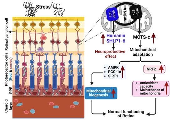The mechanism of mitochondrially derived peptides, including MOTS-c, humanin, and SHLP1-6, in the retina. Red arrow indicates upregulation/increased expression. Created with Biorender.com.