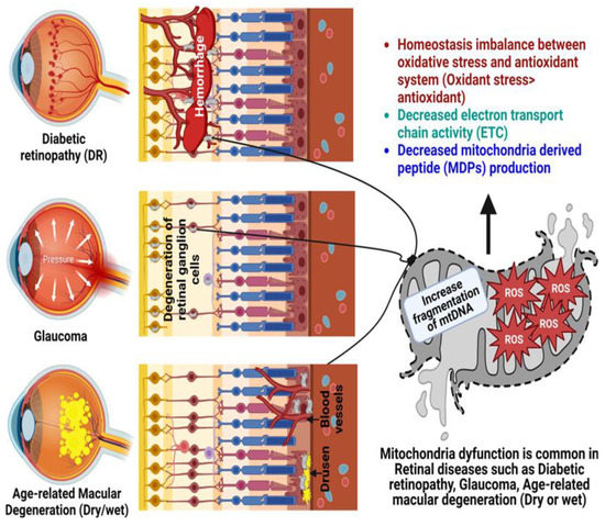 Metabolic dysfunction in neuronal cells is associated with the development of age-related neurodegenerative diseases. The net result of metabolic dysfunction includes reduced bioenergetics, increased generation of mitochondrial ROS, mitochondrial dysfunction, and cell death [14,66]. With aging, the human retina undergoes various structural and physiologic changes [67]. Aging has been associated with fewer retinal neurons (Rod PRs, RGCs, Rod bipolar cells), along with numerous age-related alterations, such as higher rate of mtDNA mutations and decreased density of cells and synapses [68,69]. mtDNA becomes damaged with age and oxidative stress, and the absence of good repair mechanisms leads to accumulative mitochondrial dysfunction, which is recognized as a crucial pathogenic element in age-related ophthalmic diseases (Figure 3), such as glaucoma, DR, and AMD [70].