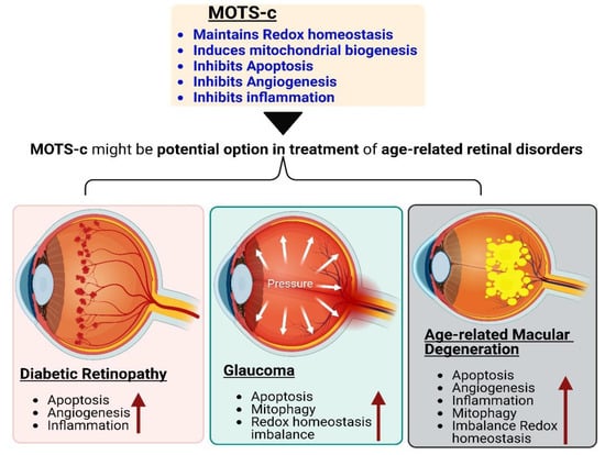 Even though mitochondria are at the heart of cellular signaling, MDPs, specifically MOTS-c, would provide promising results in the treatment of retinal disorders caused by mitochondrial dysfunction (Figure 4). The goal of this review was to show the untapped potential of MOTS-c as a therapeutic option in the treatment of age-related retinal diseases.