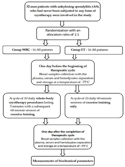 The protocol for qualifying patients for the study was similar to those of our earlier studies [19,21,22]. A total of 32 nonsmoking male patients with ankylosing spondylitis who had never been subjected to any form of cryotherapy were involved in the study. The patients were divided randomly into two groups with an allocation ratio of 1:1, i.e., 16 AS patients exposed to WBC with exercise training (WBC group, mean age 46.63 ± 1.5 years) and 16 AS patients exposed to exercise training group (ET group, mean age 45.94 ± 1.24 years). There were no significant differences in the mean age, body mass index (BMI), Bath Ankylosing Spondylitis Diseases Activity Index (BASDAI), Bath Ankylosing Spondylitis Functional Index (BASFI), and comorbidities and classical cardiovascular risk factors between groups.
