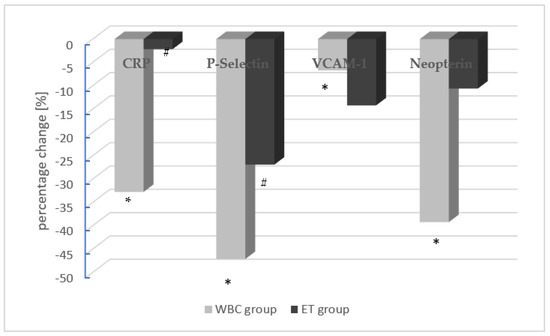 The mean percentage changes in endothelium function parameters in the WBC group (gray) and the ET group (black). The concentration of a given parameter at the first collection was assumed as 100%. Statistically significant differences between the first and second measurement (pre- and post-procedure) are marked as * and # in the WBC and ET groups, respectively (hsCRP: high-sensitivity C-reactive protein; sVCAM-1: soluble vascular cell adhesion molecule-1; (p): plasma; (s): serum).