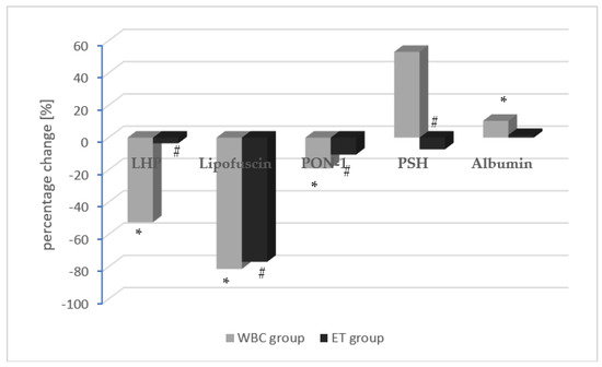 After the end of the treatment, the concentrations of LHP, lipofuscin, and PON-1 significantly decreased in both study groups, and the drop in these parameters was greater in the WBC group compared to the ET group. Moreover, after the treatment, the PSH level decreased significantly only in the ET group, but did not change significantly in the WBC group. Additionally, the albumin levels significantly increased in the WBC group, whereas they did not change after the treatments in the ET group (Table 3). The mean percentage change in oxidative stress parameters in the WBC group (gray) and the ET group (black) are also shown in Figure 3.