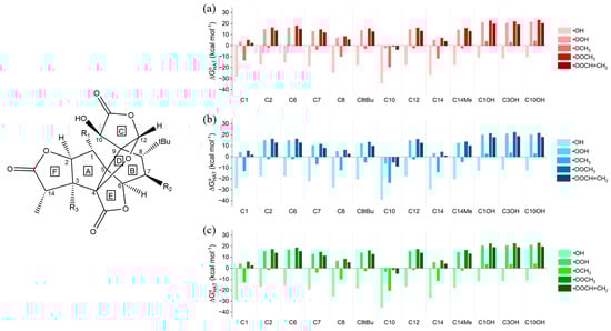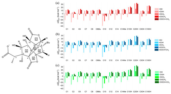 The presence of a solvent does not modify the trends stated above for ginkgolide B. Stabilization effects attributed to solvation are slight to nonexistent in the case of a HAT reaction in benzene (Figure 1c), while water is appreciably more efficient in stabilizing the ginkgolide radicals (Figure 1b), with a maximum stabilization energy () reaching −5.07 kcal mol−1. Analogous considerations are valid for the other ginkgolides (see the Supplementary Materials).