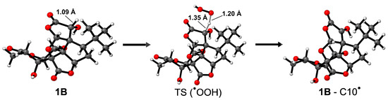 To complete the investigation of the capacities of 1B and the 1B anion as radical scavengers, we computed the activation energies () for HATs from the most reactive site, i.e., C10, in gas phase, in water and in benzene. For 1B, was also computed for one of the least favored HATs, i.e., the C10OH site. Table 3 shows the activation energies. The kinetic studies were limited to ginkgolide B, since the other ginkgolides were not expected to yield different results. Figure 4 shows the optimized structure of the transition state when HAT occurs from C10 on 1B for the scavenging of •OOH.
