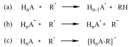 Radical scavenging can occur via multiple mechanisms, depending on different conditions; competition among different mechanisms is also possible. The well-known HAT (hydrogen-atom transfer, Scheme 2a) entails the transfer of a hydrogen atom to the radical, which is thus quenched. If multiple reactive sites are present in the molecule, an equal number of different radical products (Hn-1A•) can be formed. SET (single-electron transfer, Scheme 2b) is better suited for negatively charged scavengers, which, however, can still react via HAT; RAF (radical adduct formation, Scheme 2c) usually involves an aromatic ring, or, in general, unsaturated bonds to which ROS are added, and can also result, like HAT, in multiple products, depending on the structure of the scavenger [45].