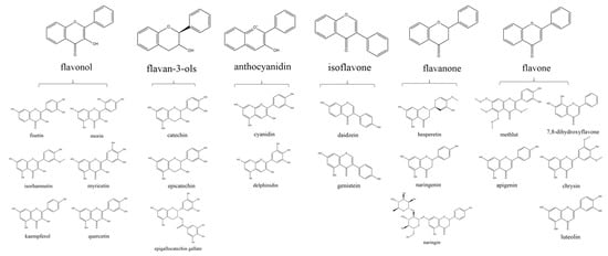 With the penetration of food and nutrition science in medical research, the significance of functional plant foods for disease prevention has been highlighted [1]. Flavonoids, the bioactive polyphenolic phytochemicals existing in natural foods, receive a wide-range of attention due to their anti-inflammatory and antioxidative properties and exhibit inspiring outcomes in various experimental and clinical studies [2,3,4,5]. Generally, flavonoids are a 15-carbon (C6–C3–C6) skeleton that is composed of two benzene rings (C6) and 3-carbon linking chain (C3) [6]. Depending on the chemical structure, flavonoids are divided into flavonols, flavan-3-ols, anthocyanidins, isoflavones, flavanones, and flavones. In the current review, we will introduce the basic classification, natural sources, and biochemical properties of 21 typical flavonoids, the classification and chemical structures of which are shown in the Figure 1, then summarize their experimental results and underlying molecular mechanisms concerning the effects on obesity, cancers, and neurogenerative diseases that greatly threaten public health.