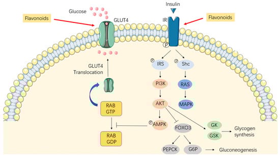 The potential mechanisms of how flavonoids intervene in insulin sensitivity. Flavonoids restore the phosphorylation of IRS and the activation of the PI3K/Akt pathway, which promotes the phosphorylation of AMPK and translocation of GLUT4 to the cell membrane, contributing to increased glucose uptake in the skeletal muscle and adipose tissue. In the liver, flavonoids inhibit gluconeogenesis and promote glycogen synthesis by improving the PI3K/Akt pathway. AMPK, AMP-activated protein kinase; AKT, protein kinase B; FOXO3, Forkhead box O3; GDP, guanosine diphosphate; GK, glucokinase; GLUT4, glucose transporter type 4; GSK, glycogen synthesis kinase; GTP, guanosine triphosphate; G6P, glucose 6-phosphate; IR, insulin receptor; IRS, insulin receptor substrate; MAPK, Mitogen-activated protein kinase; PI3K, phosphatidylinositol 3-kinases; PEPCK, phosphoenolpyruvate carboxykinase.
