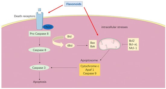 Flavonoids promote intrinsic and extrinsic apoptosis pathways. Two principal pathways are involved in cell apoptosis. The intrinsic pathway is triggered by diverse intracellular stresses, which activate cytochrome c, Apaf-1, and caspase-9 to form an apoptosome through regulation of BH3-only and Bcl2-like proteins and promote apoptosis. The extrinsic pathway induced when the TNF family binds to death receptors on the cell surface, which activates caspase-8 and caspase-3 through Fas-associated death domain protein (FADD) and provokes cellular destruction. Flavonoids induce cell apoptosis via intrinsic and extrinsic pathways.