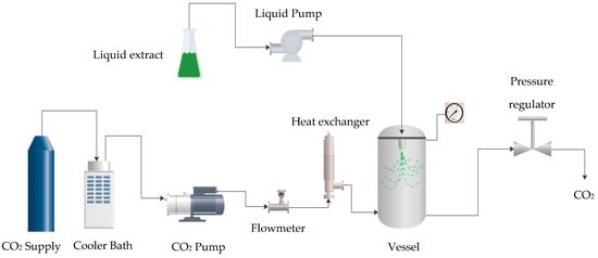There are a multitude of techniques to obtain fine particles from extracts such as spray-drying or freeze-drying that are well documented in the literature [,,]. More novel techniques, such as those involving the use of supercritical fluids (SCFs), remain to be more deeply investigated. These techniques, depending on the various nucleation and growth mechanisms involved in particle precipitation processes, can be classified into different groups according to the role to be played by the pressurized fluid, i.e., either solvent or anti-solvent []. Carbon dioxide (CO2) is the compound that is most often used for high pressure precipitation processes under supercritical conditions. CO2 is not only considered an environmentally friendly compound, but it is also non-flammable, non-toxic, and leaves no residues on the processed samples. Furthermore, it is worth noting that its critical pressure and, in particular, its relatively low critical temperature (Pc = 73.8 bar, Tc = 31.1 °C) do not represent a degradation hazard for the thermosensitive compounds that are expected to be found in most plant extracts []. In addition to this, supercritical CO2-based micronization techniques allow the generation of regular particles with minimal dimensions. This is particularly difficult to achieve when other more conventional technologies are used []. Some of the techniques based on SCFs are Particle form Gas-Saturated Solutions (PGSS), where the pressurized liquid serves as solute; Rapid Expansion of Supercritical Solutions (RESS), in which the fluid acts as solvent; and various anti-solvent processes, such as Supercritical Anti-Solvent (SAS), Gas Anti-Solvent (GAS) or the Aerosol Solvent Extraction System (ASES) []. In certain studies, supercritical antisolvent techniques have been used for the precipitation of particles from natural extracts, as in the following examples: the co-precipitation of lycopene extract using polyvinylpyrrolidone (PVP) [], the formation of Curcuma xanthorrhiza extract microparticles [], the encapsulation of diterpenes from spent coffee grounds [], microparticles from Mangifera indica leaf extract together with a fluorescent marker [], or the precipitation of Glycyrrhiza glabra []. In these cases, the process is known as Supercritical Antisolvent Extraction (SAE) []. Compared to other techniques for the production of powdered extracts and produce particles, such as spray drying, spray cooling, lyophilization or dry processes, SAE has advantages such as more homogeneous particle size distributions, the prevention of mechanical or thermal degradation of micronized compounds due to the relatively low temperatures that are often used, and the improved elimination of the used organic solvents due to the anti-solvent power of supercritical CO2 []. It is therefore an appropriate alternative to these more conventional processes for the production of micro or nanoparticles of bioactive compounds [].