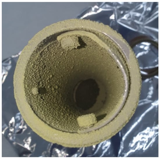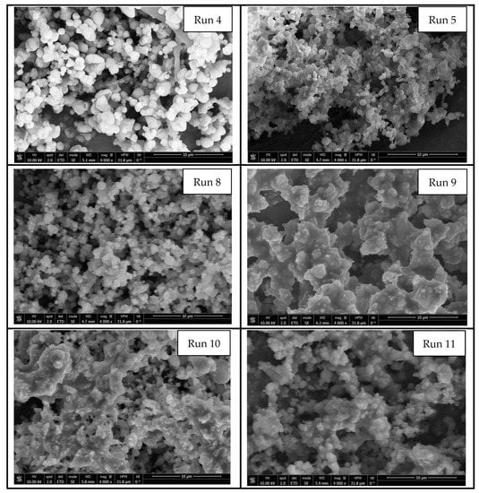 No free powder precipitate was obtained from runs 1, 2 and 3, but a sticky mixture was obtained, which makes any measurement on it difficult. Based on the study by Reverchon and De Marco, larger particle sizes and non-uniform precipitates are obtained when the operating values do not reach into the supercritical single-phase region of the vapor-liquid equilibrium diagram of the CO2-organic solution mixture []. This is in agreement with the results obtained in runs performed at low pressure (9 MPa—run 4), where clusters based on solid particles larger than one-micron size stuck together were obtained. Figure 3 shows the powder precipitated on a vessel corresponding to run 5. In general, submicron quasi-spherical particles can be observed when operating at not extremely high pressures and mild temperatures, as in run 5. This probably happens because when operating just above the supercritical conditions of the mixture, its surface tension becomes zero, especially at the end of the mixing process [].