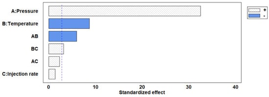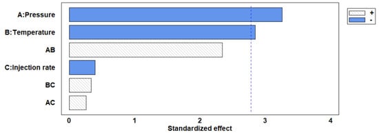 A statistical analysis of the influence on the particles’ size as a result of varying the process variables’ values was performed. The results can be seen in the Pareto chart in Figure 4. It was revealed that the process was dependent on temperature and, above all, pressure, both parameters presenting a significant effect (p < 0.05). In this regard, the extract injection rate once the desired pressure and temperature conditions had been reached did not seem to have any obvious effects. This was probably due to the micro-droplets produced by the spray and the mass transfer that took place during the precipitation stage, both of which were suitable to obtain particles of the desired size in most of the experiments. Therefore, it was concluded that the process was mainly controlled by the supersaturation of the compounds present in the extract, as discussed above.