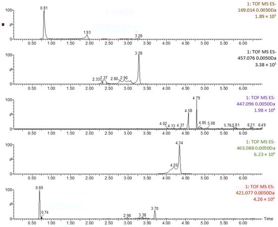 The quantification of these compounds was studied on the basis of previous studies that identified them in extracts of myrtle leaves obtained by different processes (maceration, sonication, liquid phase extraction or supercritical fluid extraction, among others) [,,,]. Figure 6 shows the spectra of run 8 where the peaks corresponding to the different compounds identified can be seen. The rest of the spectra of the extract and the rest of the samples can be seen in the supplementary material (Figures S1–S6). Table 6 shows the individual profiles for the various identified polyphenols; moreover, the concentrations of many of them vary considerably with the experimental conditions of the SAE technique.