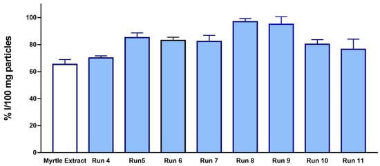 The data on the antioxidant capacity of the precipitates is shown in Figure 7, expressed as the percentage of inhibition of the oxidation per 100 mg of particles. The antioxidant activity of the SAE precipitates of myrtle leaf extracts according to the DPPH oxidation tests were all higher than those of the previously used extracts (65.4% I/100 mg dry weight of extract). This fact supports the high efficiency of the SAE process to obtain potent antioxidant products that not only preserve their original bioactivity capacity, but it is also improved in most cases. This enhanced bioactivity must be closely related to the ability of scCO2 to produce precipitated fractions mostly composed of polyphenolic compounds with a marked oxidant capacity, while others are removed. Similar enhancements of the bioactive capacity have been observed when SAE and ethanolic extracts have been applied to other raw materials such as grape seeds [], mango leaves [,], or grape residue [].