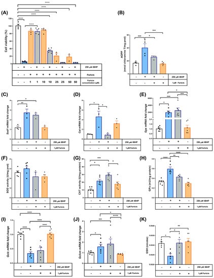 Cytoprotective and antioxidant role of myrtle particles in murine macrophage cell lines. (A) Viability of the cells treated with 250 µM tBHP for 1 h according to MTT assay. Cytoprotective effect of the different concentrations of myrtle particles ranging from 1 to 50 µM. Antioxidant properties at a concentration of 1 µM myrtle particles (B) Advanced Oxidation Protein Products (AOPPs). qPCR assays for genes encoding free radical scavenging enzymes: SOD1 (C), CAT (D) and GPX (E). The expression values represent four biological replicates and are shown relative to the β-Actin expression as a housekeeping gene. The mRNA levels of the control group for each gene were set at 1. Activity of the antioxidant enzymes superoxide dismutase (F), catalase (G) and glutathione peroxidase (H). (I) Reduced glutathione content. mRNA levels of the catalytic (J) and modifier (K) subunits of the Glutamate-cysteine ligase. The expression values represent four biological replicates and are shown relative to the β-Actin expression as a housekeeping gene. The mRNA levels of the control group for each gene were set at 1. The results are represented as the mean ± SEM. * p < 0.05; ** p < 0.01; *** p < 0.001; **** p < 0.0001. “+” (compound added) “–” (not added). Circles: control; squares: 250 µM tBHP added; up triangle: co-treatment with tBHP + particle; down triangle: only particle treatment.