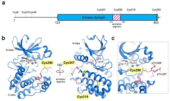 AURKA consists of a non-conserved, flexible auxiliary N-terminal domain and a C-terminal conserved kinase domain (Figure 1). AURKA contains three cysteine residues (at amino acids positions 8, 33, and 49) in the N-terminal auxiliary domain and four cysteine residues (at amino acids positions 247, 290, 319, and 393) in the C-terminal kinase domain (Figure 1a). Unlike the kinase domain, the N-terminal domain of AURKA still needs to be further studied to clarify its function. However, several studies have explored the functional and structural role of the N-terminal domain, including a docking site for AURKA cofactors, or implications for autoinhibitory interactions [,]. As the function of cysteine residues in the N-terminal domain has not been systemically tested, we focused on the role of cysteine residues in the kinase domain of AURKA. Similar to other kinases, AURKA displays a canonical bilobal fold consisting of N-, and C-lobes and an ATP-binding cleft between the lobes (Figure 1b) []. All four cysteine residues in the kinase domain of AURKA are located in the C-terminal lobe of the kinase, and only Cys290 and Cys393 are exposed to the solvent surface []. Previous reports detected that mutation of these solvent exposed residues improves the stability of the protein and forces the protein to exist as a monomer in solution, suggesting that those solvent-exposed cysteine residues are involved in the formation of inter-molecular disulfide bonds leading to the formation of homodimer in higher multimers []. Nevertheless, further investigation is needed to confirm the physiological roles of the formation of inter-molecular disulfides. Of the two surface-exposed residues, Cys290 seems to play a critical role, as it lies at the center of the activation segment of the kinase domain, while Cys393 is located at the C-terminal flexible tail (Figure 1c). The kinase activity of the AURKA depends on and is regulated by the phosphorylation state of the strictly conserved residue, Thr288, located within the activation segment, a conserved structural element in most eukaryotic kinase families. It is now well established that the conformation of the activation segment consisting of Asp-Phe-Gly (DFG) motif, activation loop which contains the site of regulatory phosphorylation (Thr288 in AURKA), and APE (Ala-Pro-Glu) motif, controls kinase activity [] The phosphorylation of Thr288 leads to the global structural reorganization required for the activation of AURKA, involving remodeling and releasing the autoinhibited “DFG-in” state and conformational change of the activation segment that enables the binding of substrate []. As the conformation of the activation segment critically determines the kinase activity, the redox modification of Cys290, which is located in the vicinity of Thr288, is expected to significantly affect the overall activity of the kinase.
