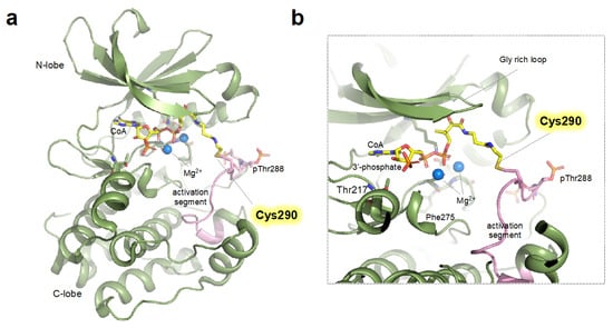 The previous study reported by Tsuchiya et al. revealed the detailed biophysical and structural basis of the CoA-mediated AURKA inhibition []. Kinome-wide screening of CoA against various protein kinases revealed that CoA specifically inhibits the catalytic activity of AURKA. Mass spectrometric and mutational analyses confirmed that the CoA molecule covalently modified the Cys290, and the modification of Cys290 decreased AURKA phosphotransferase activity towards myelin basic protein substrate in a dose dependent manner []. The crystal structure of CoAlated Cys290 AURKA elucidated the structural basis of the inhibitory effect of Cys290 CoAlation (Figure 2). In the crystal structure, the 3′-phospho-ADP moiety of CoA was bound to the ATP-binding pocket of the kinase domain of AURKA, suggesting that the CoA can occupy the ATP-binding pocket and thus compete with cellular ATP (Figure 2b). The pantetheine moiety of CoA stretches toward the catalytic activation segment of AURKA, allowing the sulfhydryl group to form a disulfide bond with the Cys290 located in the vicinity of Thr288.