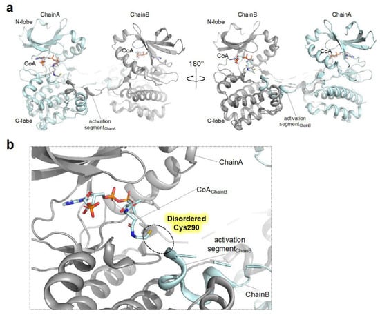 Although the study by Tsuchiya et al. detailed the structural and biophysical basis for CoA- mediated AURKA inhibition, the effect of CoAlation on AURKA does not seem straightforward, as other Cys290 CoAlated structures have shown the structural implication of CoAlation for the AURKA activation (Figure 3) []. A study by Lim et al. reported a CoA-bound structure displaying an activation segment-swapped homodimer, a more catalytically competent conformation (Figure 3). Contrary to the monomer structure reported by Tsuchiya et al. this structure contained a homodimer and CoA molecules covalently bounded to the Cys290 residues of neighboring monomers, suggesting that the formation of the Cys290-CoA covalent bond may facilitate stabilization of the activation segment swapped dimeric structure, which would consequently promote the autophosphorylation of Thr288 (Figure 3b). Whether the CoAlation leads to the formation of dimeric structure in solution needs further investigation. As the authors used a TPX2-fused chimeric protein, with the N-terminal AURKA residues (at positions 1–115) replaced with TPX2 (at positions 7–20), the structure might reflect that of the distinct CoA-bound AURKA in the presence of TPX2.