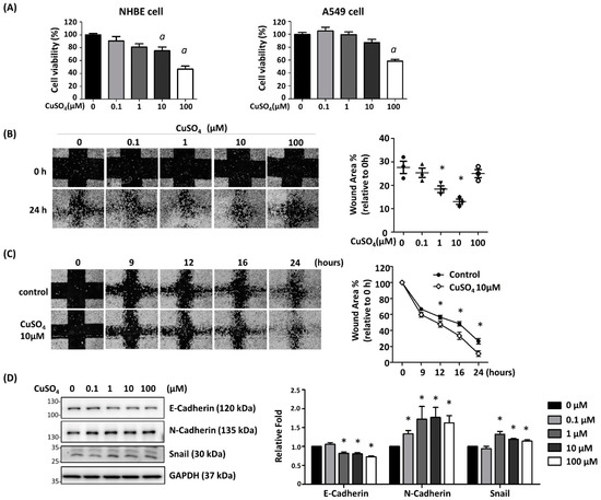 Dose and time effects of CuSO4 on cell viability and EMT. (A) HBE and A549 cells were treated with various doses of CuSO4 from 0.1~100 μM for 24 h, and the cell viability was determined by CCK-8 assay. a: p < 0.05 compared with the control group. (B) The dose effect of CuSO4 on A549 migration ability. A549 cells were treated with various doses of CuSO4 for 24 h, and wounds were made for wound healing assay. 12 h after treatment, the wound coverage was determined. (C) The wound coverage of CuSO4-treated cells at different time points. A549 were treated with 10 μM CuSO4 and the wound coverage was determined. (C) At different time points after the wound was made, the GAP% was determined. The wound area was measured and represented as GAP%. Mean + SEM. (D) A549 cells were treated with various doses of CuSO4 for 24 h. The protein expressions of EMT-related proteins were examined by Western blot. The quantitative results were shown in right panel. * p < 0.05. All experiments were performed three times and the representative image was shown.