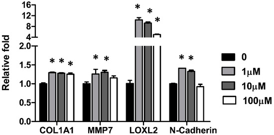 The effect of CuSO4 on the epithelial-mesenchymal protein expressions was determined. A549 cells were treated with CuSO4 at doses from 0.1 μM to 100 μM for 24 h, and the protein expressions were determined by Western blot. The results show that CuSO4 increases expressions of mesenchymal proteins including N-Cadherin. The expression of the epithelial marker, E-Cadherin, was reduced by CuSO4 treatment at a dosage higher than 1 μM (Figure 1D). Moreover, several lung fibrotic marker expressions from cells treated with 1 uM for 48 h were examined by real-time PCR. The results show that COL1A1, MMP7, LOXL2, and N-Cadherin were upregulated by CuSO4 (Figure 2). These results demonstrated that CuSO4 treatment induced fibrogenic changes in the lung epithelial cells.