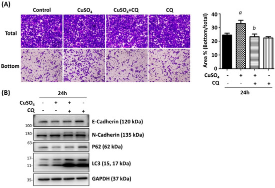 Inhibition of autophagy reversed CuSO4-induced cell migration. (A) A549 cells were pre-treated with chloroquine (CQ, 5 μM) for 2 h, followed by 10 μM of CuSO4 for another 24 h. a: p < 0.05 compared with the control group. b: p < 0.05 compared with CuSO4 only group. (B) The protein expressions were examined by Western blot. The quantitative results were shown in the right panel. Mean ± SEM.