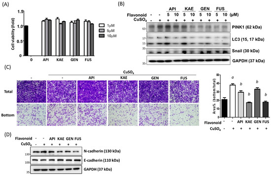 Flavonoid reversed CuSO4-induced EMT changes. (A) A549 cells were treated with 1 μM, 5 μM, and 10 μM of flavonoids (API: apigenin, KAE: kaempferol, GEN: genkwanin, FUS: fustin) for 24 h. After treatment, the cell viability was determined by CCK-8 assay. Mean ± SEM, (B) A549 cells were pre-treated with flavonoids for 2 h followed by combined treatment of 10 μM CuSO4 for 3 h. The protein expressions were determined by Western blot against PINK1, LC3, and Snail. GAPDH served as internal control. (C) A549 cells were pretreated with various flavonoids (10 μM) for 2 h followed by combined treatment with CuSO4 for 24 h. After treatment, the cells were harvested and re-plated into a trans-well. 24 h after incubation, the cells were fixed and the total and bottom cells are images to determine the migration activity. The quantitative results are shown in right panel. Mean ± SEM. a: significant compared with control group. b: significant compared with CuSO4 group. (D) The protein expression of EMT markers N-Cadherin and E-Cadherin were examined by Western blot. All experiments were performed three times and the representative images are shown.