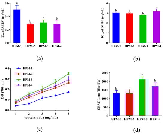 In vitro antioxidant assays of four fractions of HPM after ultrafiltration: (a) IC50 values of ABTS+ assay; (b) IC50 values of DPPH assay (c) reducing power assay; (d) ORAC assay. Data were expressed as mean ± SD (n = 3, p < 0.05). Different letters indicate significant differences (p < 0.05).
