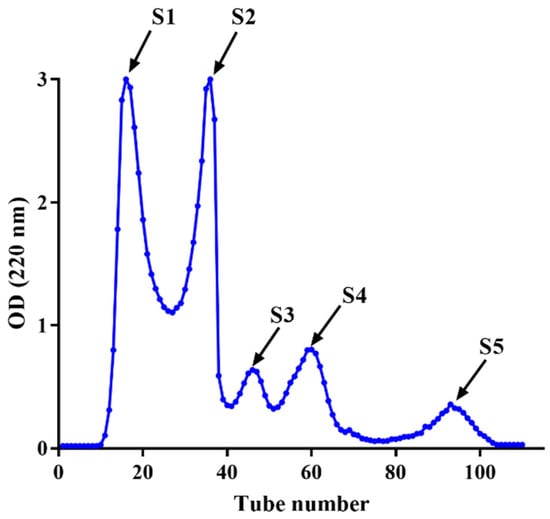 The fraction after ultrafiltration exhibiting the highest antioxidant activity was further purified by Sephadex G-25 column (2.6 × 60 cm) gel filtration chromatography []. Briefly, a 10 mL sample was dissolved in distilled water with a concentration of 15 mg/mL after being filtered through a 0.22 μm pore-size water-phase membrane. The column was then eluted with distilled water at a flow rate of 1.2 mL/min. Each fraction was collected at 5 min intervals with a fraction collector that was monitored at 220 nm (UV755B, Shanghai Youke Instrument Co. Ltd., Shanghai, China). The pooled fractions were freeze-dried using a freeze-dryer (ALPHA 1–2 LDplus, Osterode, Germany) for further use.