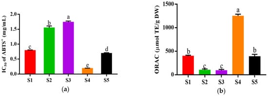 In vitro antioxidant activity of different fractions from HPM-3 separated by Sephadex G-25 gel chromatography: (a) IC50 values of ABTS+ assay of five fractions; (b) ORAC values of five fractions. Data were expressed as mean ± SD (n = 3, p < 0.05). Different letters indicate significant differences. (p < 0.05).