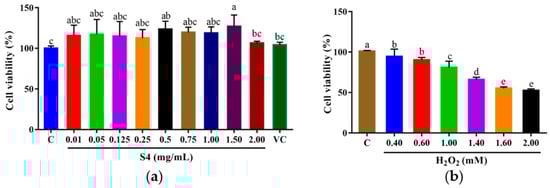 Cell viabilities of HepG2 cells treated with (a) S4 peptide or VC and (b) H2O2 at different concentrations. “C” represents the control group. Data were expressed as mean ± SD (n3, p < 0.05). Different letters indicate significant differences (p < 0.05).