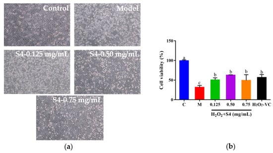 Effects of S4 at different concentrations on (a) cell morphology and (b) cell viability of H2O2-treated HepG2 cells. “C” represents the control group, and “M” represents the model group. Data were expressed as mean ± SD (n3, p < 0.05). Different letters indicate significant differences (p < 0.05).