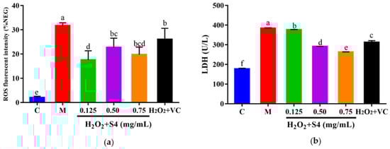 The ROS fluorescence intensity of samples was quantified with a microplate reader. As presented in Figure 6a, H2O2 treatment significantly increased intracellular ROS levels, triggering a 15-fold higher (p < 0.05) fluorescence intensity compared with that of the control group. However, the ROS level was notably (p < 0.05) reduced by treatment with S4 (0.125–0.75 mg/mL) or VC. Similarly, after 6 h of H2O2 exposure, a significant increase (2.2-fold, p < 0.05) in LDH level was observed in HepG2 cells, while treatment with S4 significantly decreased (p < 0.05) LDH levels in a dose-dependent manner (approximately 1.99% in low concentration, 22.19% in medium concentration, and 31.51% in high concentration, respectively), showing the better effect in reducing LDH levels than VC (500 μM).
