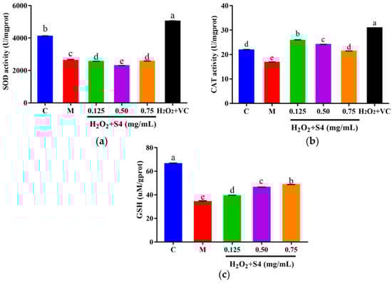 (a) SOD, (b) CAT activities, and (c) GSH level of HepG2 cells after S4 treatment. “C” represents the control group, and “M” represents the model group. Data were expressed as mean ± SD (n ≥ 3, p < 0.05). Different letters indicate significant differences (p < 0.05).