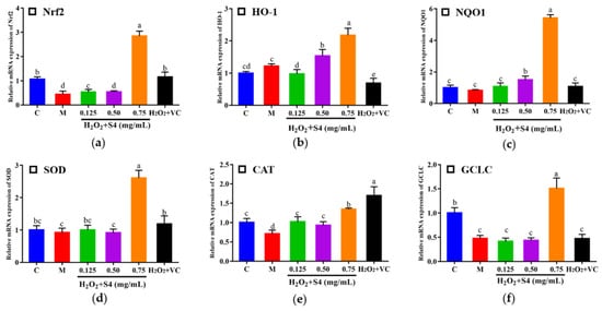 Effects of S4 on the relative expression of key genes in the Nrf2 signaling pathway: (a) Nrf2; (b) HO-1; (c) NQO1; (d) SOD; (e) CAT; (f) GCLC. “C” represents the control group, and “M” represents the model group. Data were expressed as mean ± SD (n ≥ 3, p < 0.05). Different letters indicate significant differences (p < 0.05).