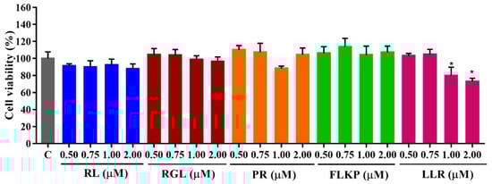 As shown in Figure 10, the survival rates of HepG2 cells remained above 80% after treatment with the four synthetic peptides (RL, RGL, PR, and FLKP) in the tested concentration (0.50–2.00 M) for 24 h. There was also no significant difference (p < 0.05) from the control group, which indicated they did not have toxic effects on HepG2 cells. After being treated with LLR, the cell viability decreased in a dose-dependent manner (1.00–2.00 μM of LLR), which indicated LLR was toxic to the HepG2 cells. Hence, the synthetic peptides were used for the further test with the above concentration except for the peptide LLR.